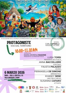 In occasione della Giornata Internazionale della Donna, la Rete regionale dei Comitati Unici di Garanzia (CUG) celebra l’evento con un’importante iniziativa dal titolo “Protagoniste – Voci dal territorio”. L’appuntamento in corso oggi, 6 marzo 2026, a Bari, dalle 10:00 alle 13:30, presso la Sala Convegni al quinto piano della sede regionale di Via G. Gentile, 52.