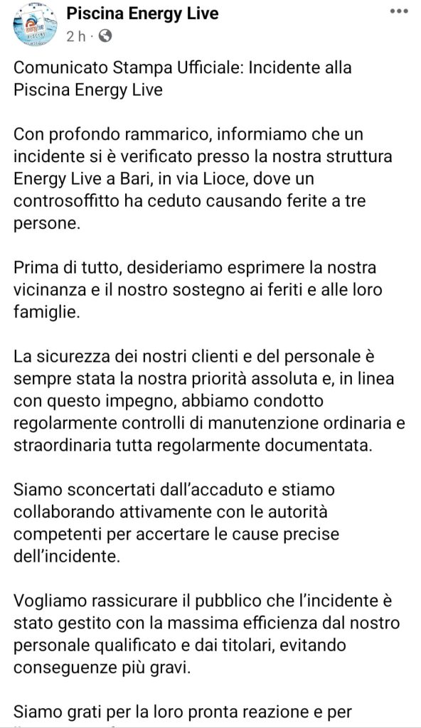 Crollo in piscina a Bari: struttura sotto sequestro e indagini in corso